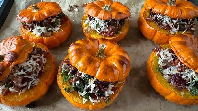 - Slice the tops off 4 mini pumpkins, scoop out seeds, drizzle with olive oil, and bake at 375°F for 25 minutes.