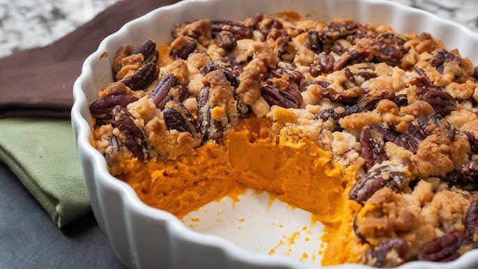 - Top with a streusel of chopped pecans, flour, and brown sugar.