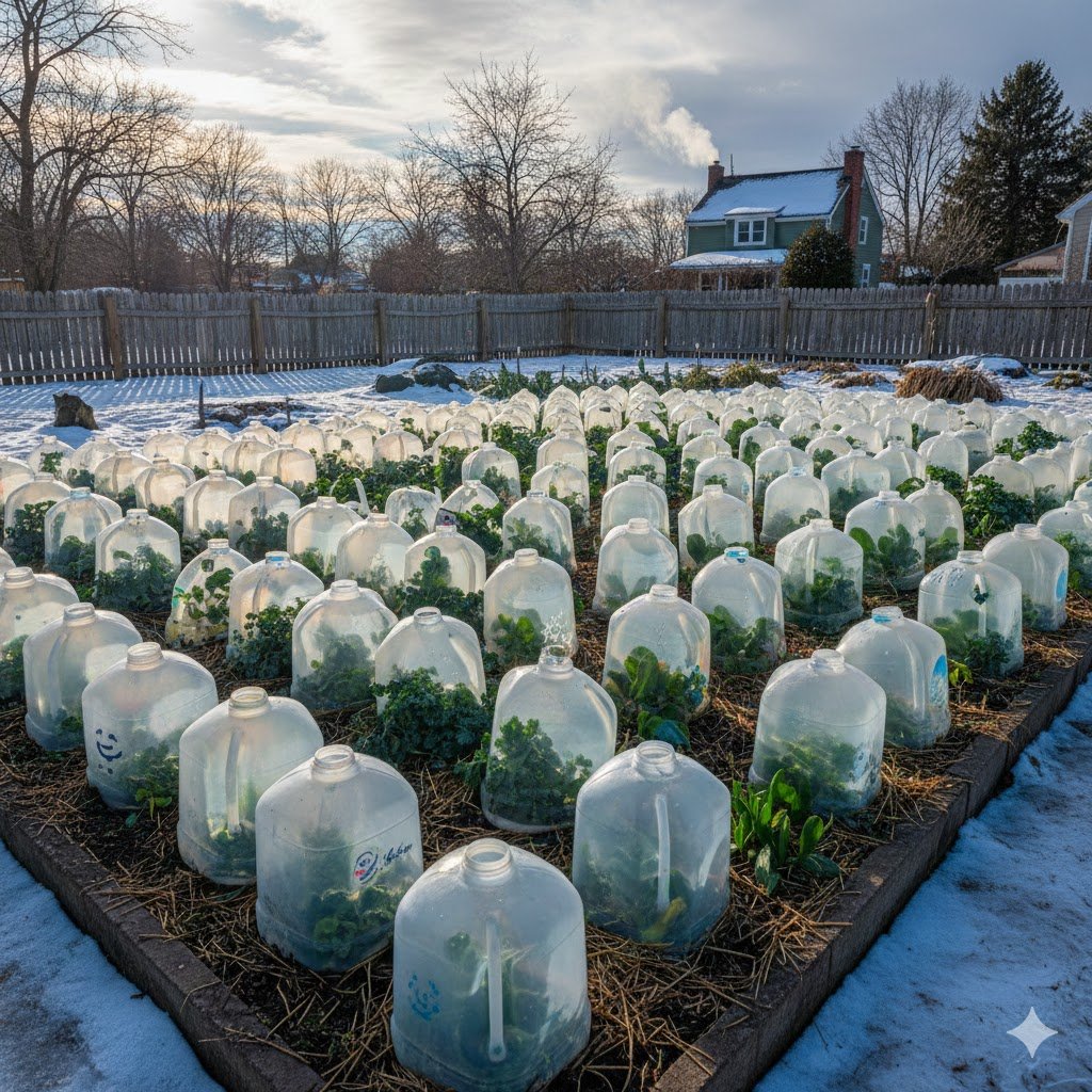 The real “pro tip” here is in the cap management. During the day, even a cold winter sun can turn a sealed plastic jug into a miniature oven, which will wilt your plants in hours. I leave the caps off during the day to allow for ventilation. About an hour before sunset, I go around and screw the caps back on to trap the residual warmth of the soil for the night.