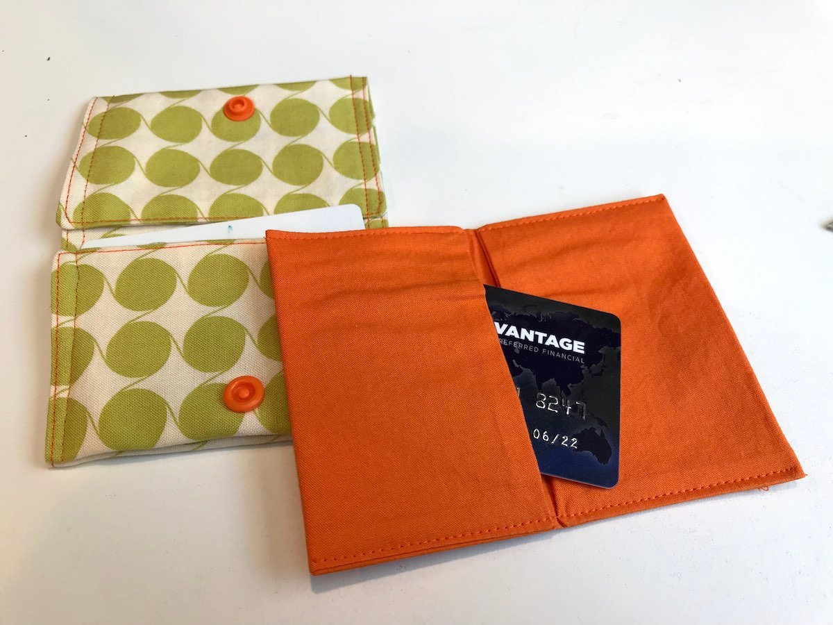 Begin by cutting two identical fabric rectangles (about 4″ x 5″). Sew or glue three of the sides together, leaving one short edge open for inserting the card. Fold the top down like a flap and fasten it with a button, snap, or piece of velcro. If you’re not handy with a needle and thread, fabric glue works great too.