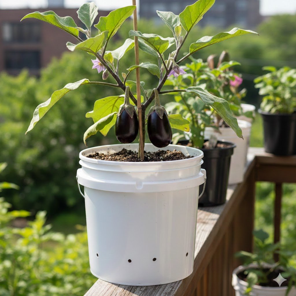 Eggplants are honestly some of the most beautiful plants you can grow. The “Fairytale” variety has these gorgeous purple-and-white striped fruits that look like they belong in a gourmet magazine. They also happen to love the confined, warm environment of a bucket.