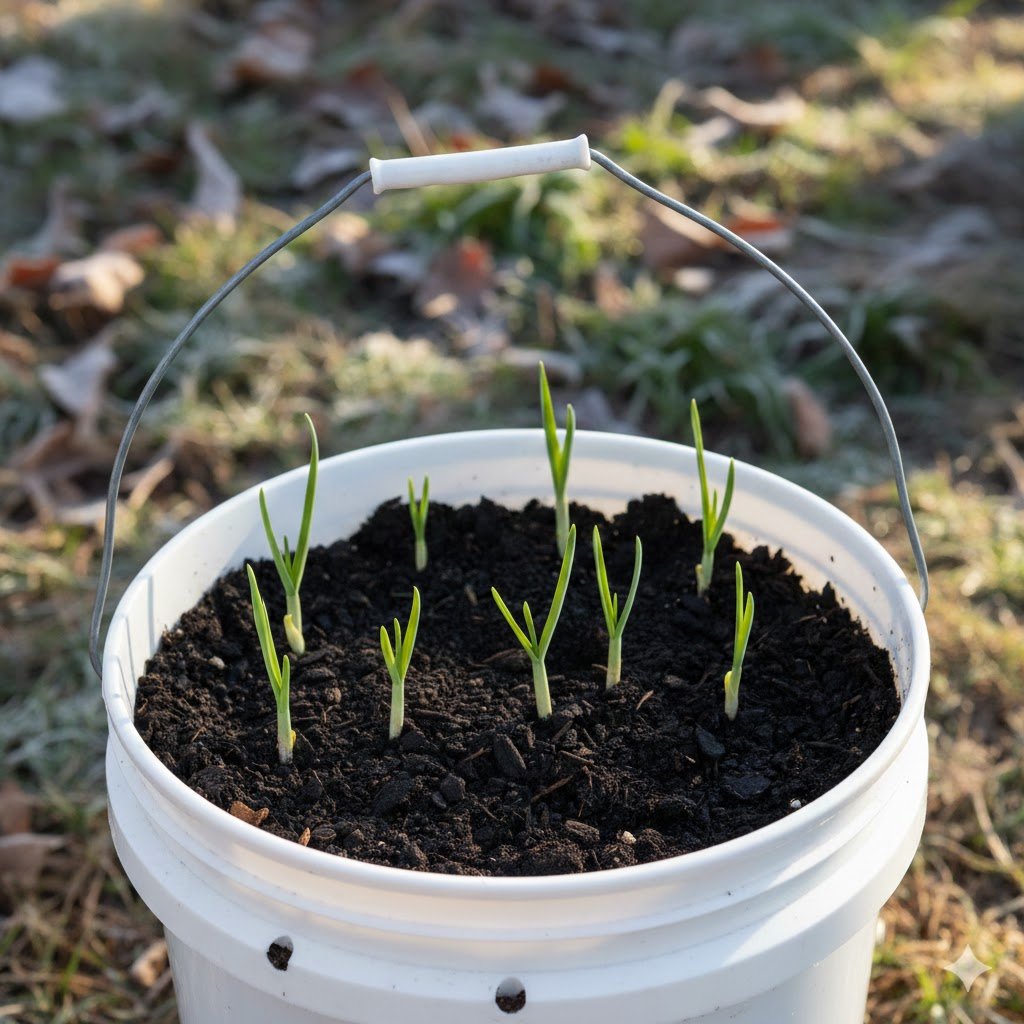 Most people think you need a big farm to grow garlic, but it loves a bucket. You plant the cloves in the fall (around October), leave the bucket outside all winter, and harvest in June.