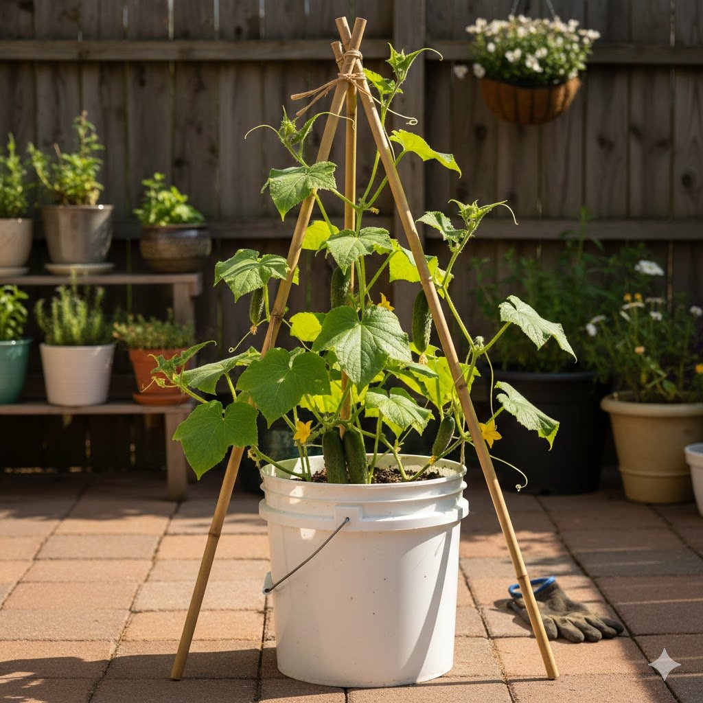 I like to shove a small A-frame trellis right into the bucket. The vines will naturally want to climb, which keeps the cucumbers off the ground and away from slugs. There is nothing worse than picking a beautiful cucumber only to find a slug has already turned the bottom into a studio apartment.
