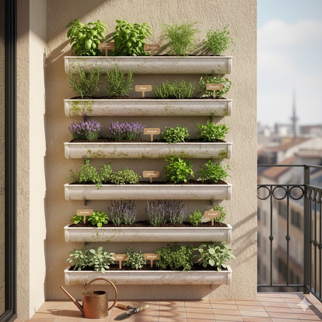 Reusing old aluminum or vinyl gutter sections is a brilliant way to create long, linear planting spaces. You mount the sections horizontally onto a wall or fence, creating neat, successive rows of herbs. This method is excellent for providing uniform planting depth across a large wall area.