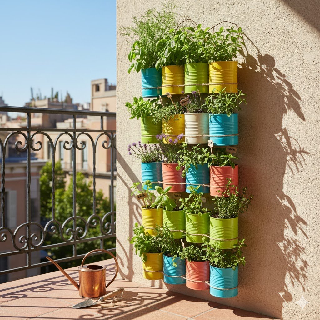 If your DIY style leans toward colorful and cute, a tin can tower is a delightful project. This involves painting and attaching varying-sized tin cans (pierced for drainage) to a narrow wooden plank or pole. The final structure is a cheerful, vertical column of greenery that adds a wonderful pop of color to the balcony.