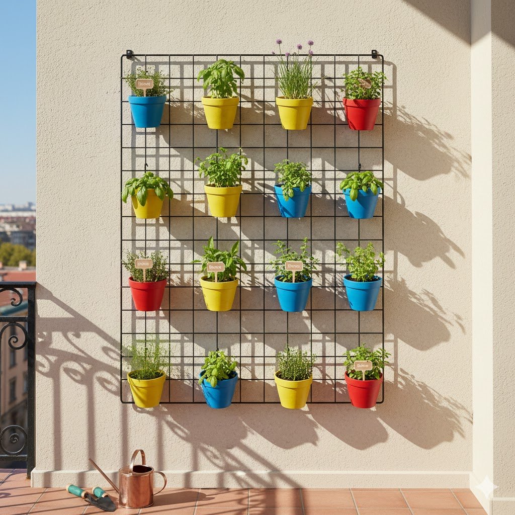 Because you can easily move the containers, this is the best setup for rotational gardening. You can shift a sun-loving Basil pot up, and move a shade-loving Mint pot down, optimizing light exposure constantly. Use herbs that look great dangling, like trailing Rosemary or creeping Thyme, which will weave themselves through the grid over time, creating a beautiful effect.