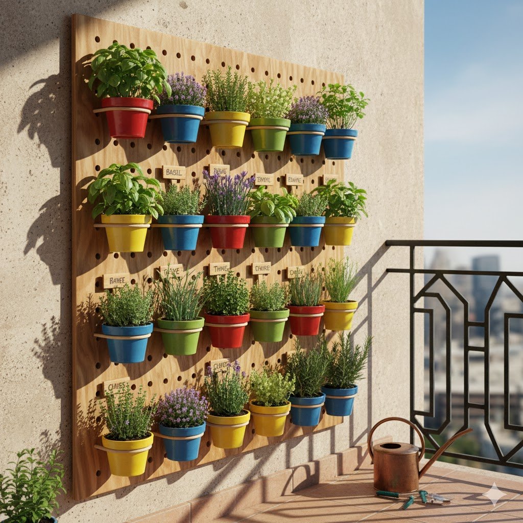 A wooden pegboard offers a delightful mix of structure and flexibility, giving your balcony the look of an organized workspace. You use a large sheet of painted wooden pegboard and attach small, simple shelves, brackets, or hooks that can be moved around as your herbs grow or as you change your design whim.