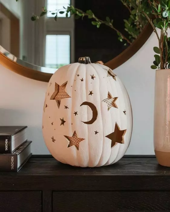 Tap into the magic of the night sky by painting stars, moons, and constellations on your pumpkin. A black or deep navy background painted onto the pumpkin works well if you want the white celestial details to pop.