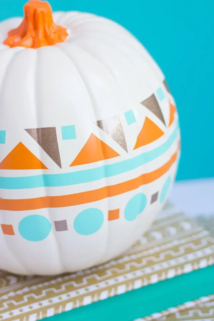 Geometric patterns bring a modern edge to fall decorating. Use painter’s tape or washi tape to create triangles, diamonds, or chevron patterns on your white pumpkin. Paint each section a different color or keep it monochrome for a clean look.