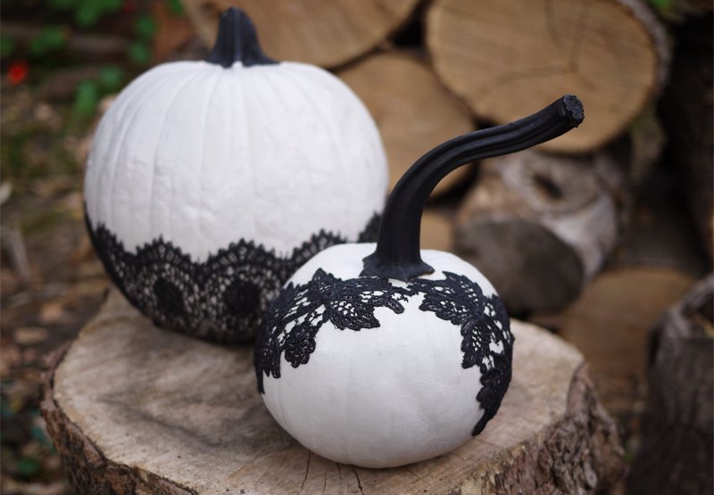 Create a delicate lace effect by stenciling or hand-painting intricate patterns using white or cream paint on your white pumpkin. Use real lace as a stencil or replicate the look freehand for a handcrafted feel.