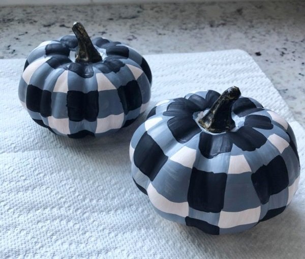 A classic farmhouse staple, black and white buffalo check gives your white pumpkin that timeless country charm. Use painter’s tape to section off stripes and paint alternating squares in black to form the iconic pattern.