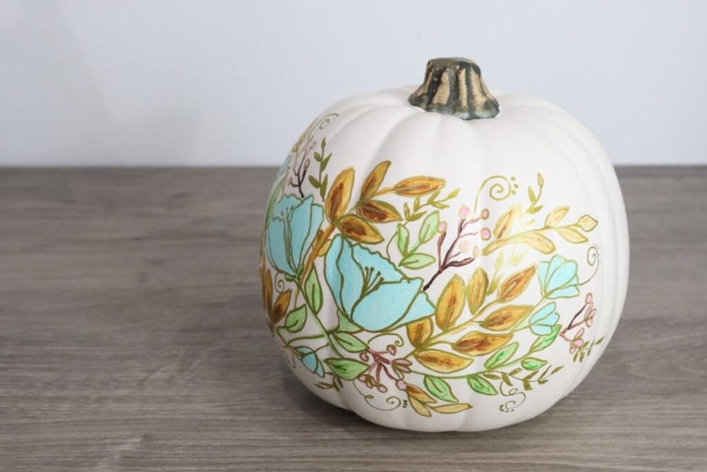 Bring the outdoors inside with a pumpkin painted in botanical motifs. Think trailing vines, eucalyptus leaves, or fern fronds painted in soft greens and earthy browns for a nature-inspired look.